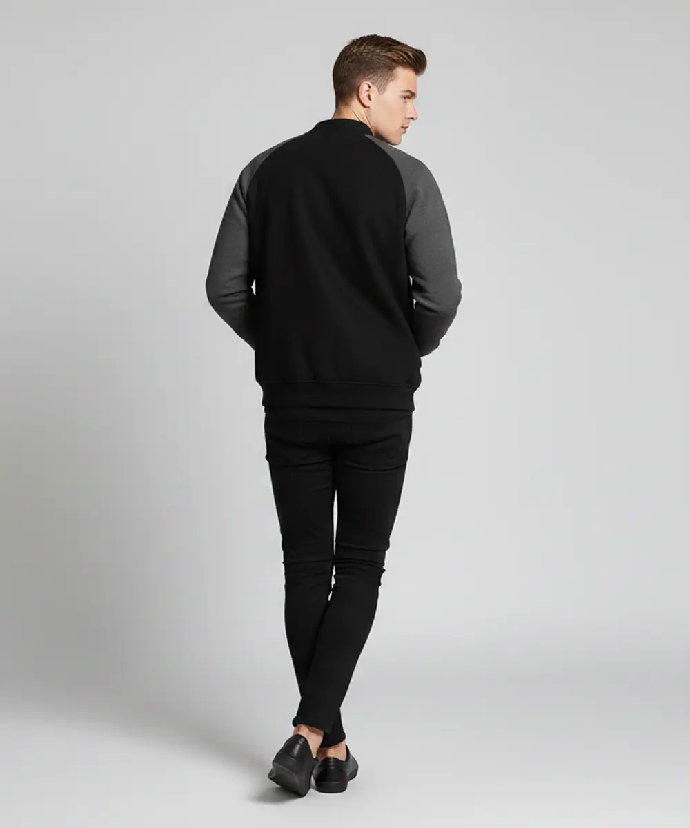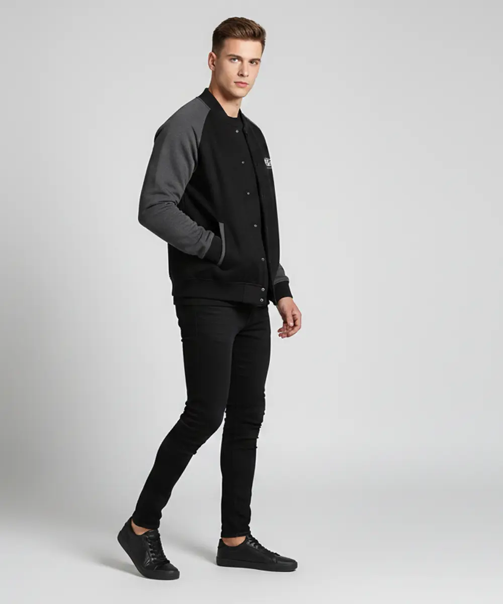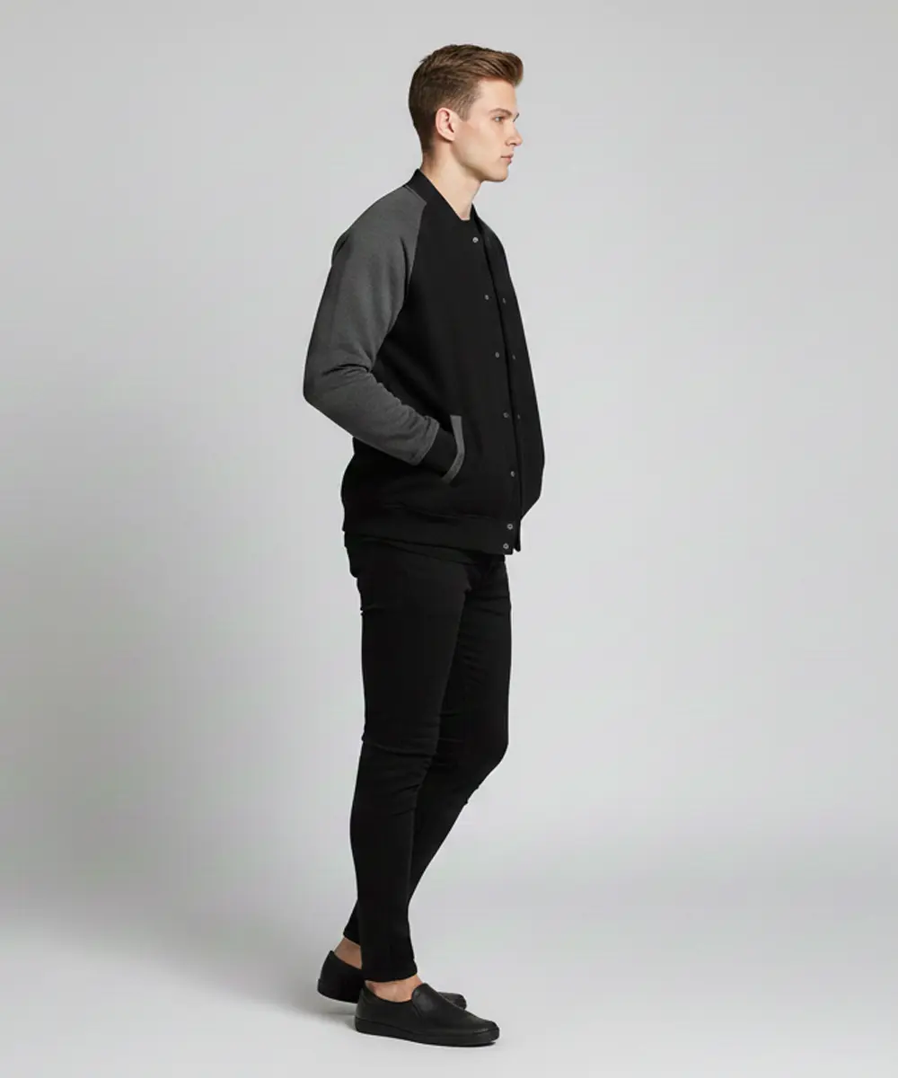 Modern Minimalist Design: A clean varsity-inspired jacket with a sleek snap-button front and smooth bomber-style structure.