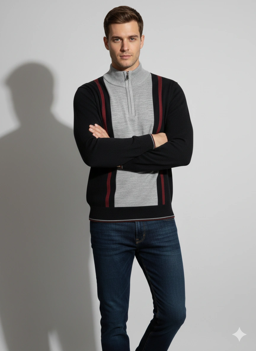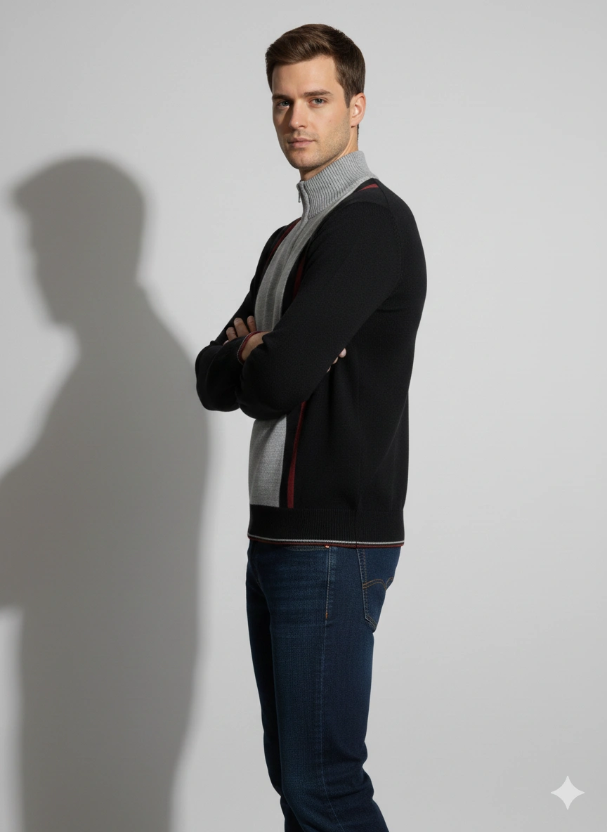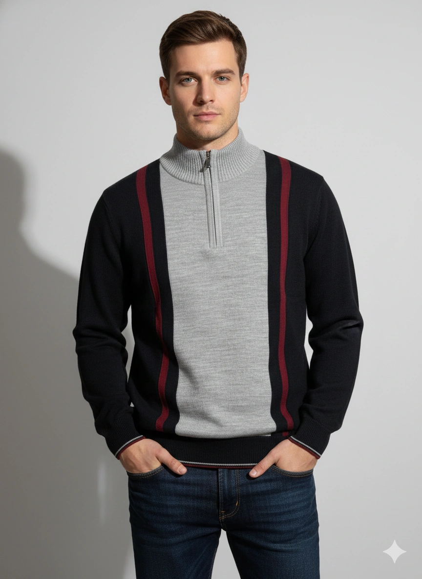 This men’s half-zip pullover delivers a modern, structured look with its bold contrast panels and refined stand collar. Crafted from a soft, durable blended yarn, it offers warmth without the bulk and provides all-day comfort during cooler seasons. The half-zip neckline allows versatile styling—wear it zipped for a smart, polished look or open for relaxed layering. Ribbed cuffs and hem give it a clean, tailored finish. Perfect for pairing with jeans or chinos for smart-casual winter outfits.