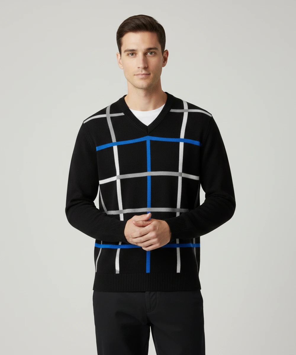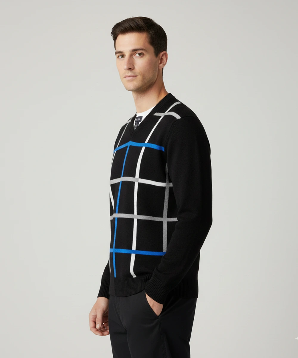 This men’s V-neck check sweater blends timeless style with a comfortable, modern fit. Made from a soft, blended knit, it provides lightweight warmth perfect for both casual and smart dressing. The bold check pattern adds a refined statement while maintaining a clean, minimal aesthetic. Ribbed cuffs and hem ensure a structured look that holds its shape throughout the day. Ideal for layering over tees or shirts, making it a versatile wardrobe essential.