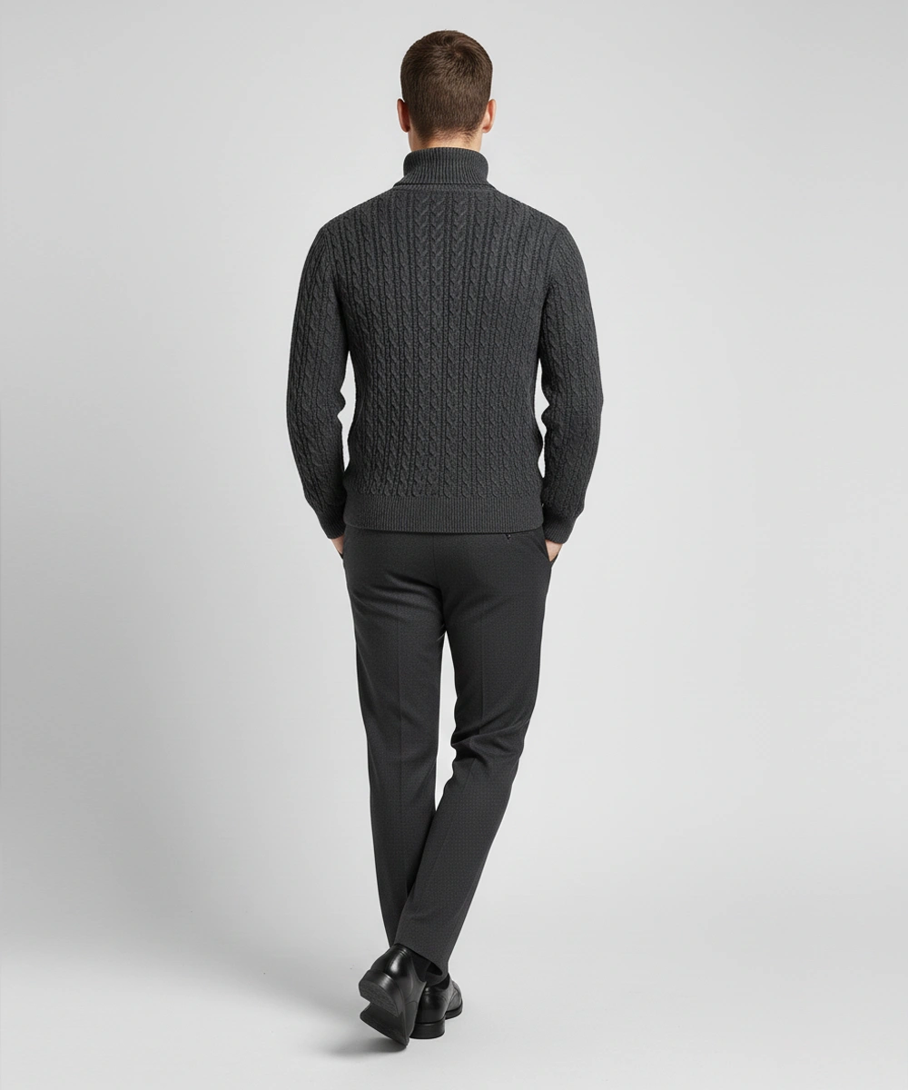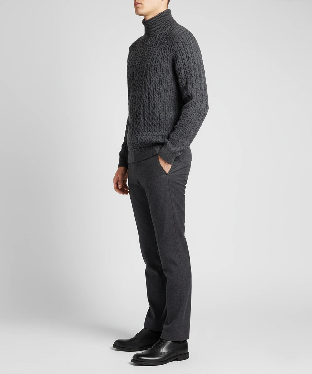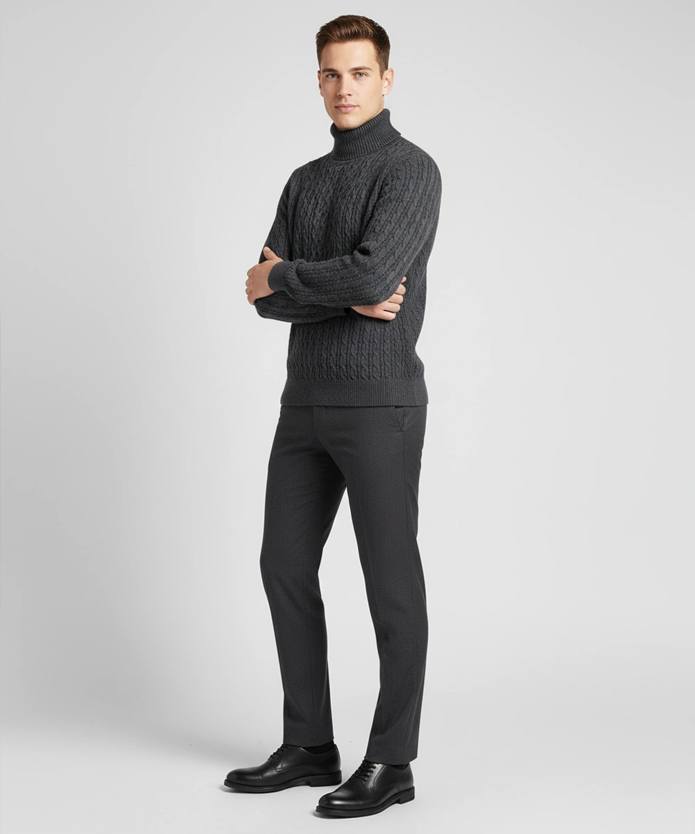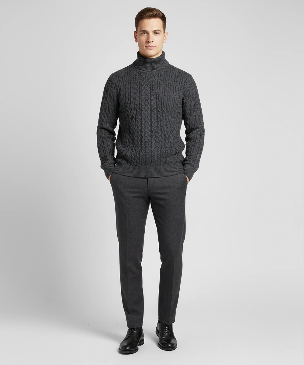 This men’s cable-knit turtleneck pullover blends timeless winter style with a warm, comfortable fit. Made from a soft blended yarn, it features a rich cable texture and a structured roll-neck design that provides superior insulation in cold weather. Ribbed cuffs and hem deliver a sharp, tailored silhouette while helping the sweater maintain its shape. Perfect for pairing with jeans, tailored trousers, or boots for an elevated winter look. Ideal for work, evenings out, or classic everyday layering.