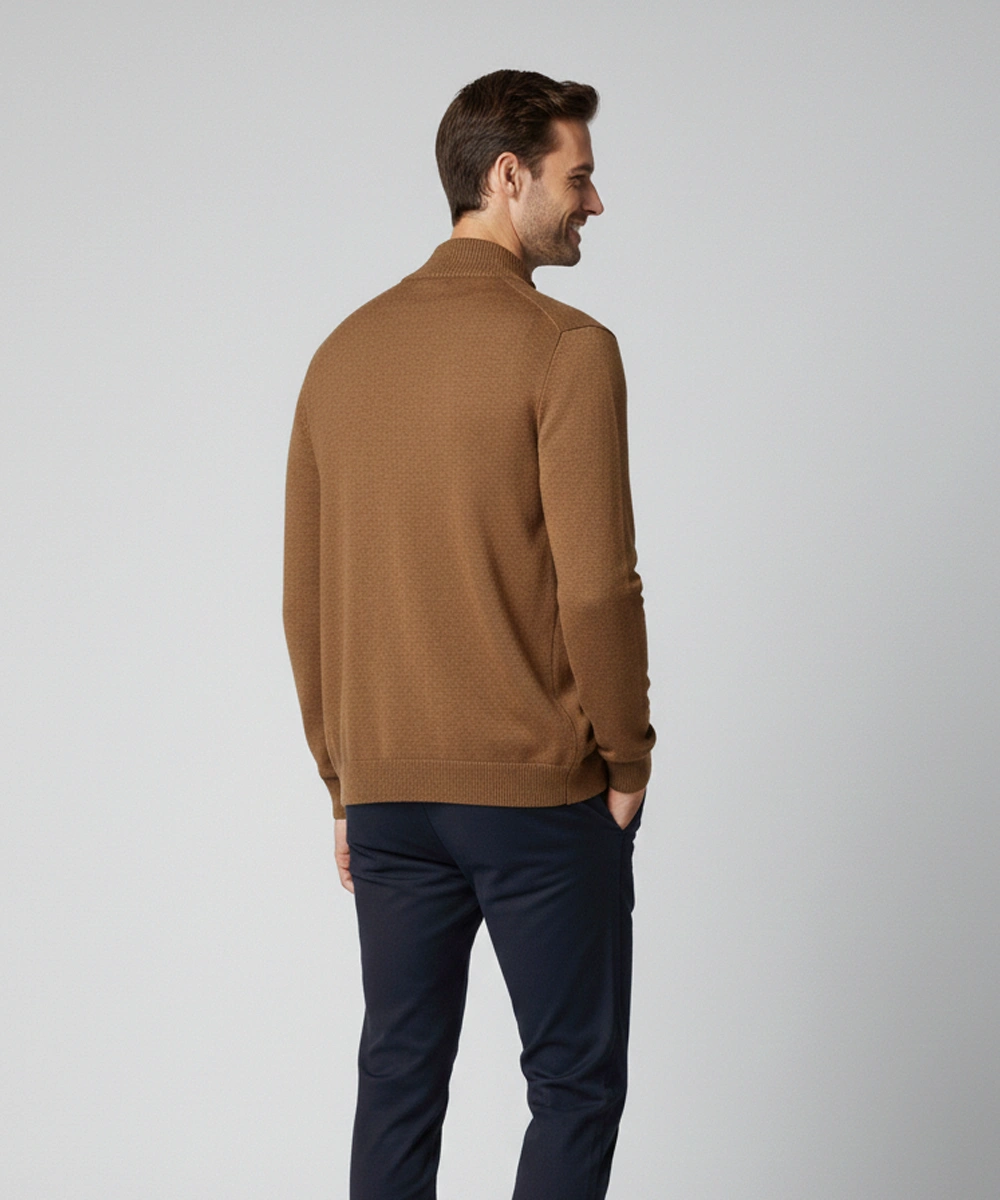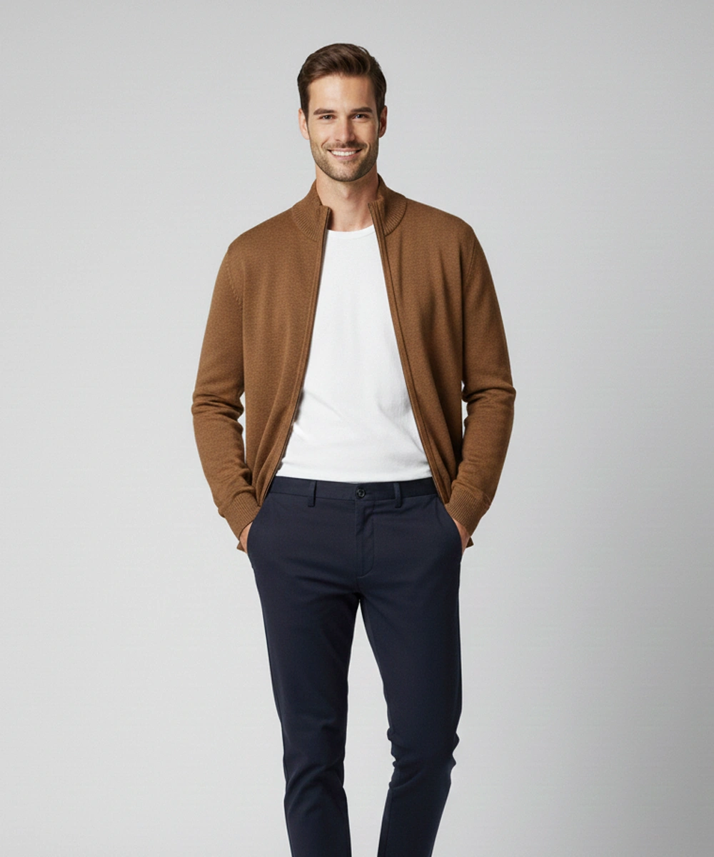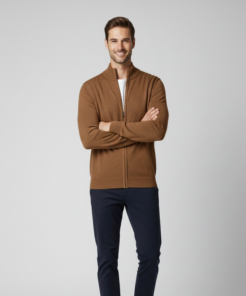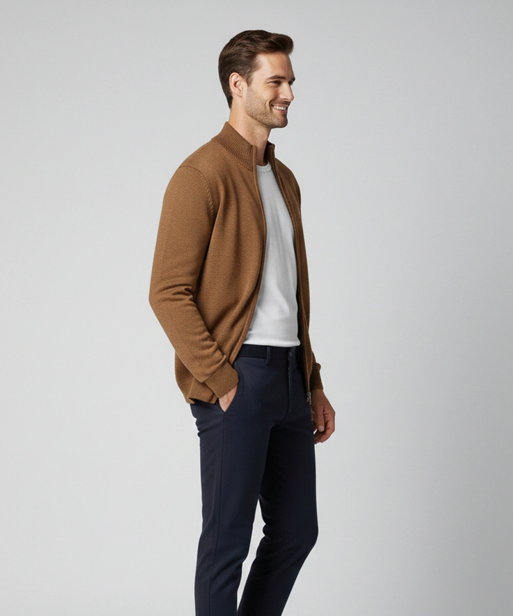 This men’s full-zip knitted sweater combines everyday comfort with a clean, modern design that elevates any outfit. Made from a soft, lightweight blended yarn, it offers just the right amount of warmth without feeling heavy or bulky. The stand collar and smooth front zipper provide a refined look, making it easy to layer over T-shirts, shirts, or winter basics. Ribbed cuffs and hem keep the fit structured and neat throughout the day. A versatile wardrobe essential perfect for work, travel, and casual wear.