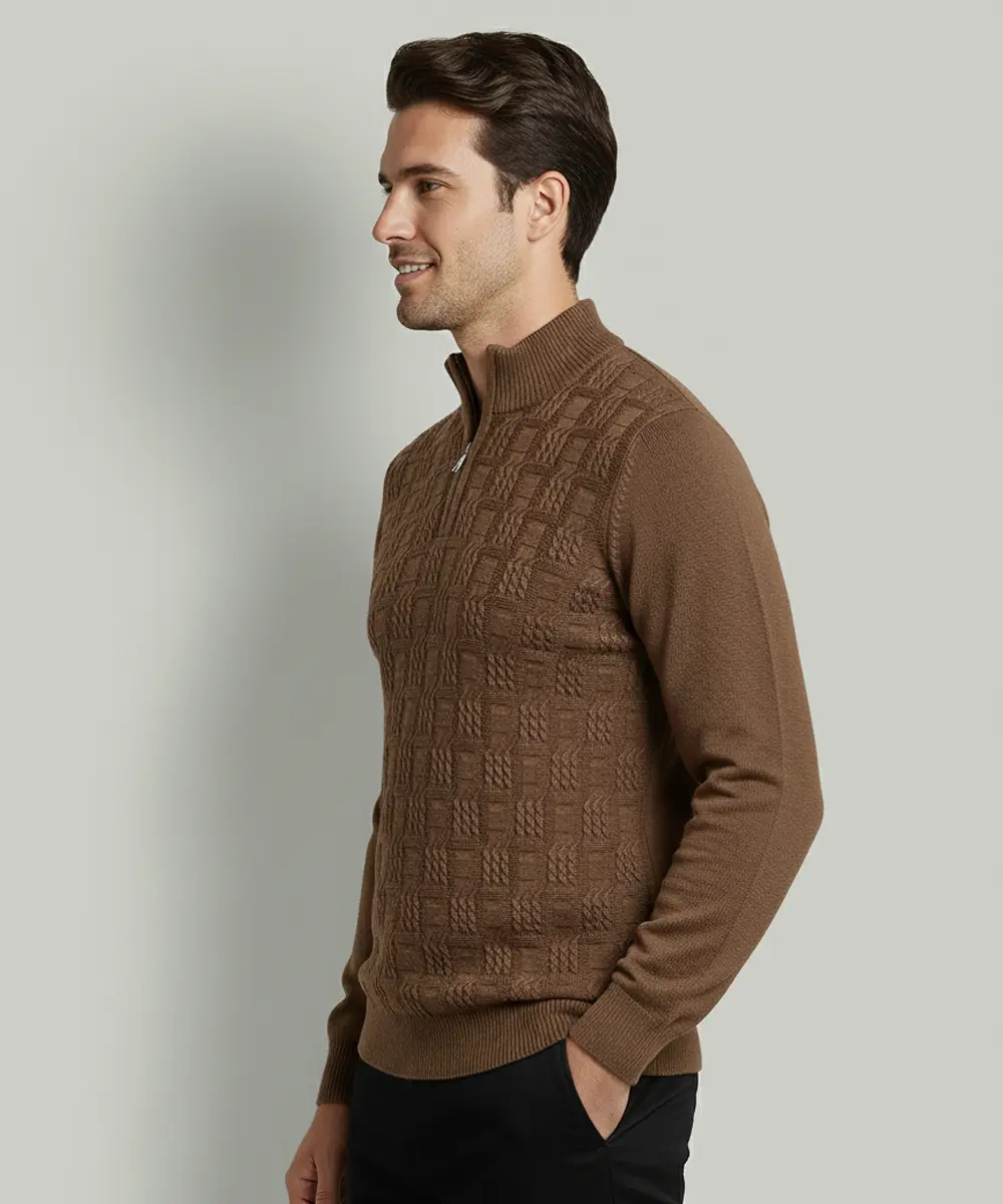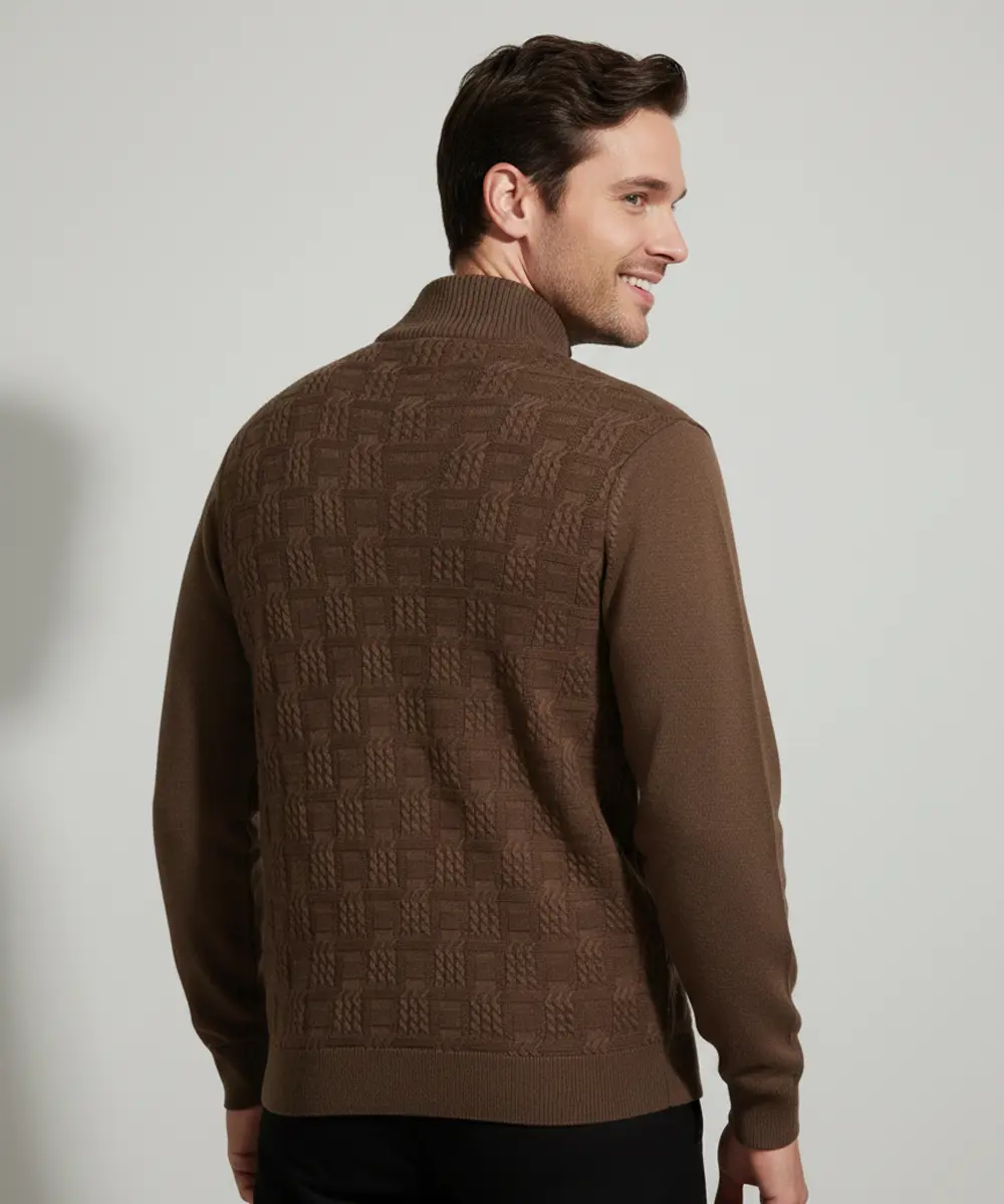This men’s jacquard half-zip sweater brings together refined texture and everyday comfort for a polished winter essential. Featuring an intricate jacquard knit front panel, it adds depth and character while maintaining a sleek, modern silhouette. The stand collar and half-zip neckline provide versatile styling—wear it zipped for warmth or open for a relaxed, layered look. Crafted from a soft and durable blended yarn, it offers lightweight warmth ideal for cool weather. Perfect for pairing with chinos, jeans, or tailored trousers for both casual and smart settings.