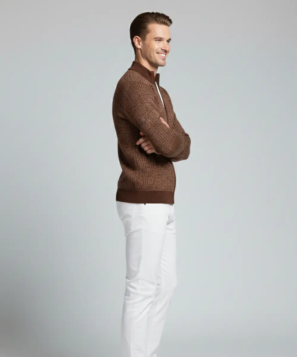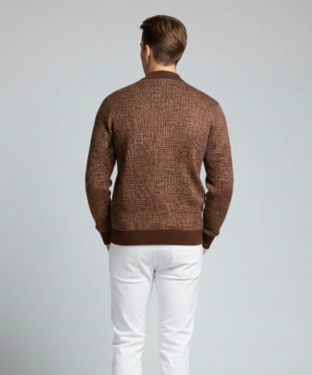Men’s Chocolate Brown Textured Pattern Zip-Up Knit Sweater