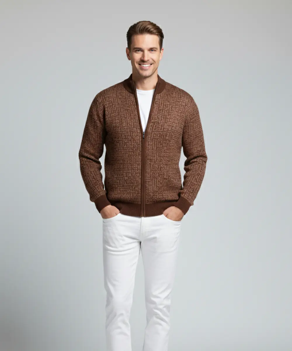 Be the first to review “Men’s Chocolate Brown Textured Pattern Zip-Up Knit Sweater”