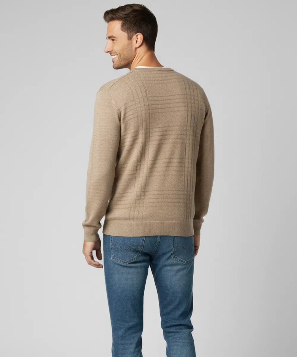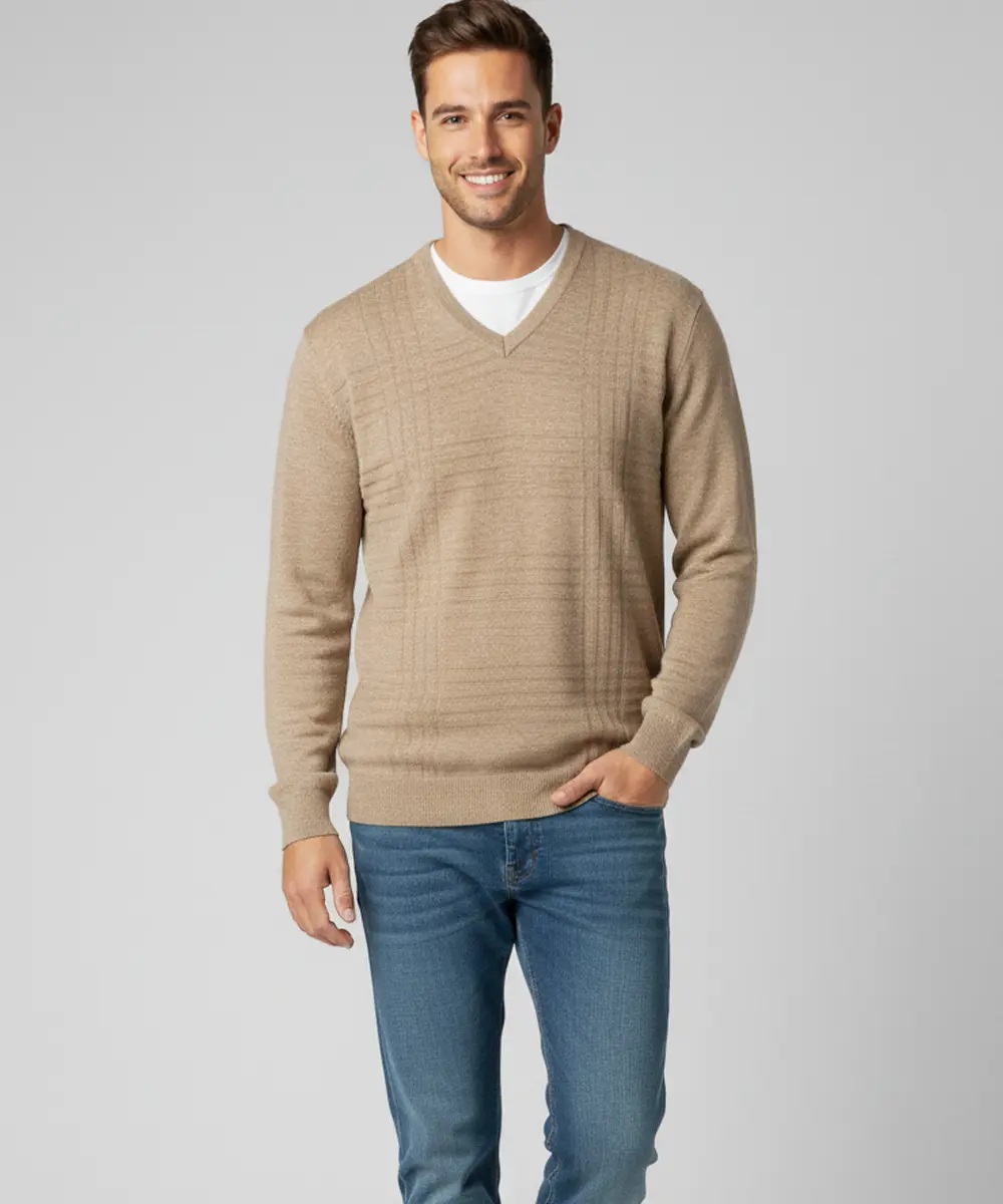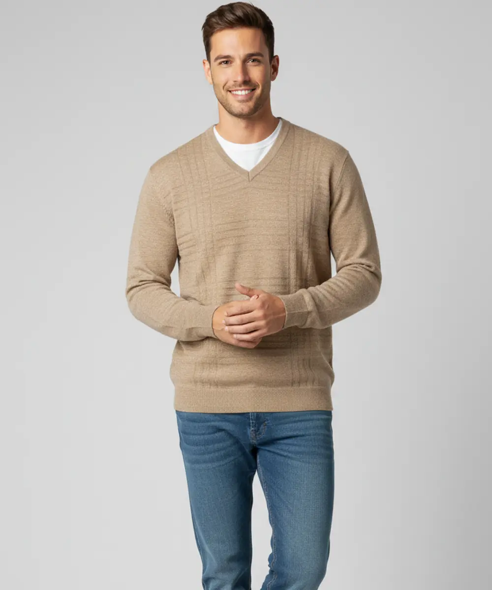 This men’s V-neck knit sweater delivers a refined, casual look with timeless appeal. Designed with a subtle all-over pattern, it balances style and comfort effortlessly. The tailored fit makes it ideal for both everyday wear and smart-casual occasions. Easy to layer or wear on its own, it’s a versatile wardrobe essential.
