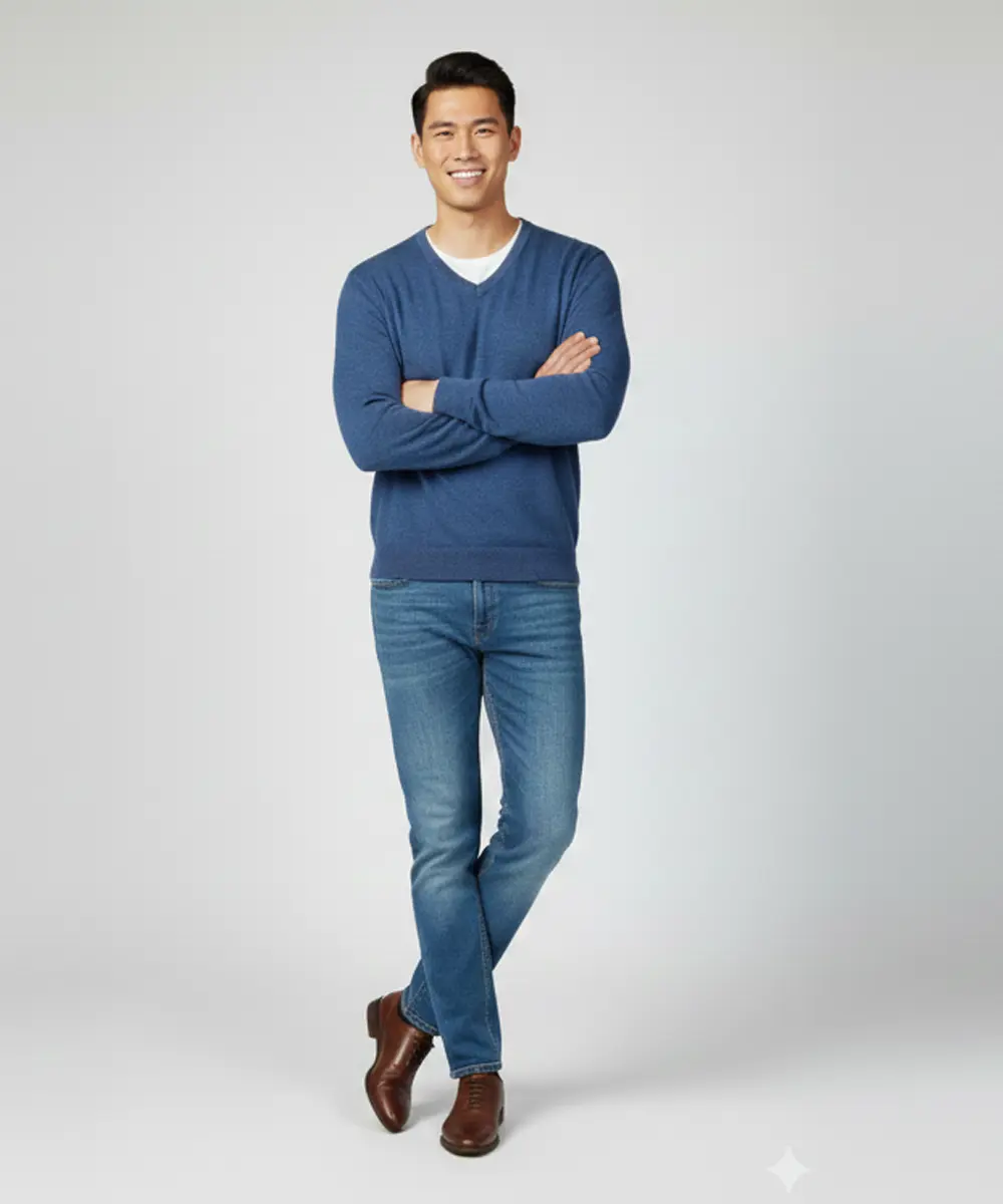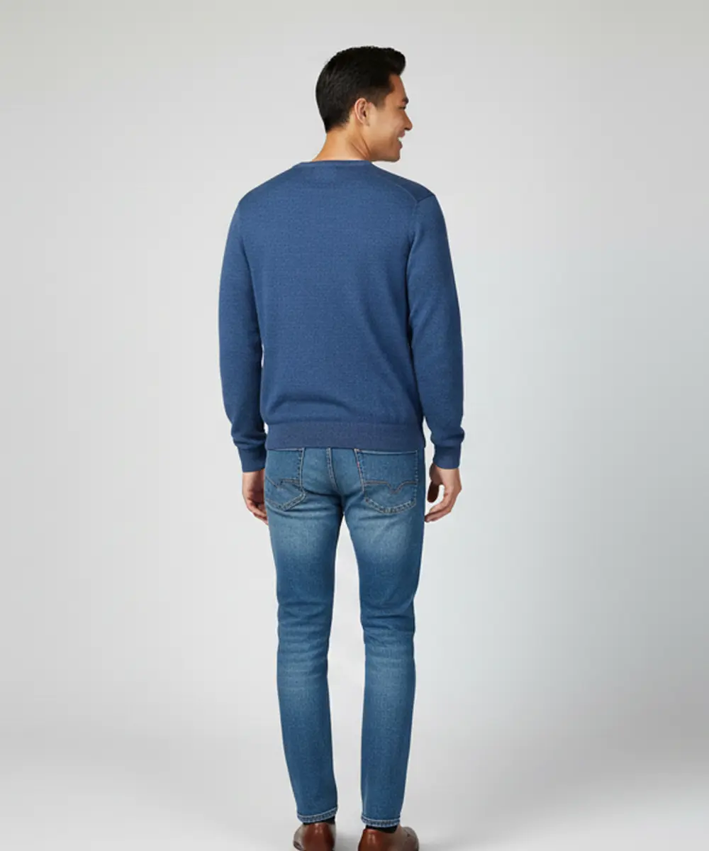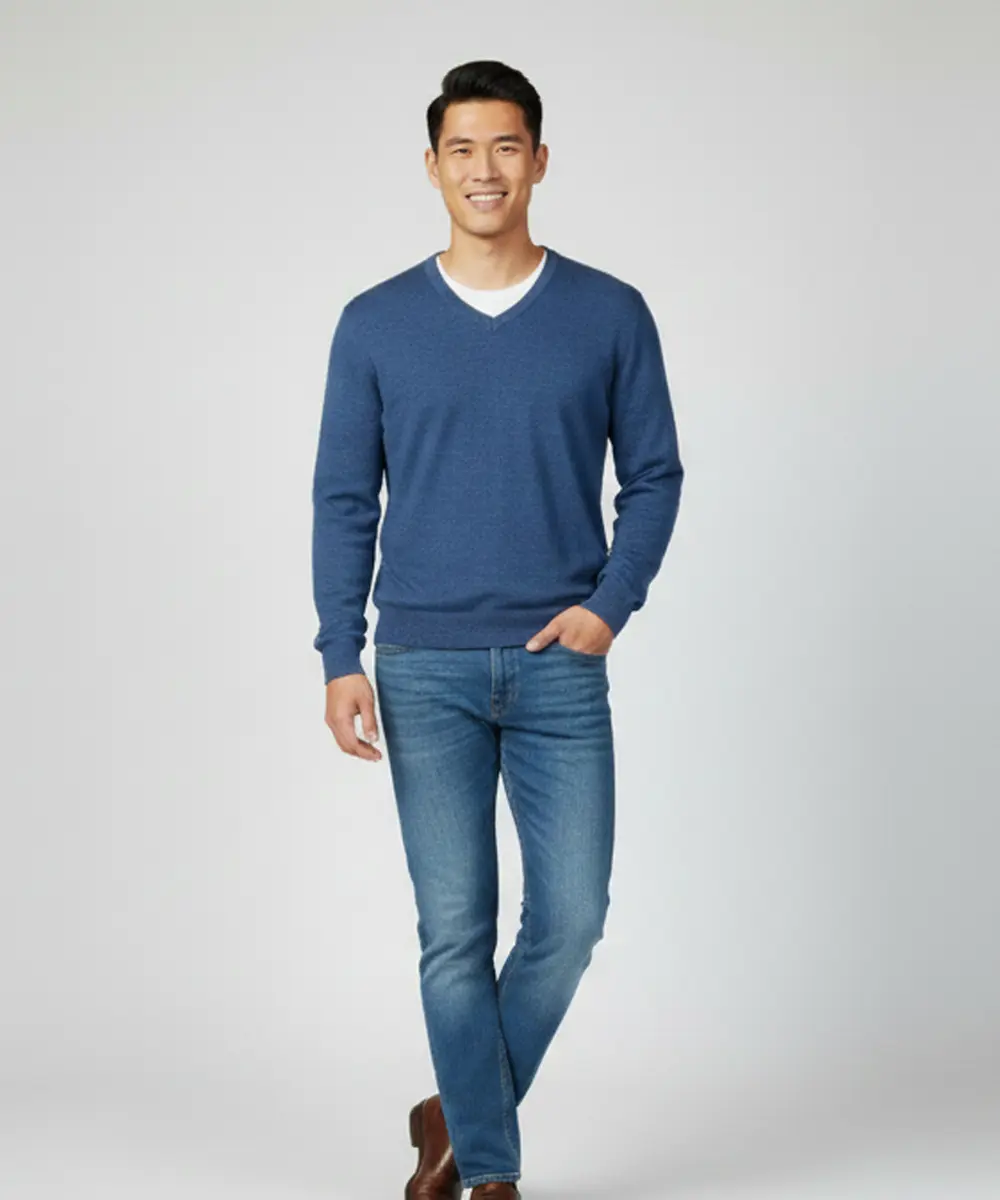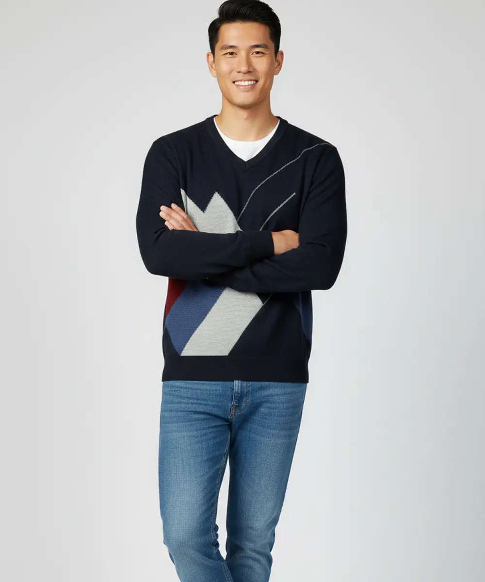 This men’s V-neck knit sweater delivers a refined, casual look with timeless appeal. Designed with a subtle all-over pattern, it balances style and comfort effortlessly. The tailored fit makes it ideal for both everyday wear and smart-casual occasions. Easy to layer or wear on its own, it’s a versatile wardrobe essential.