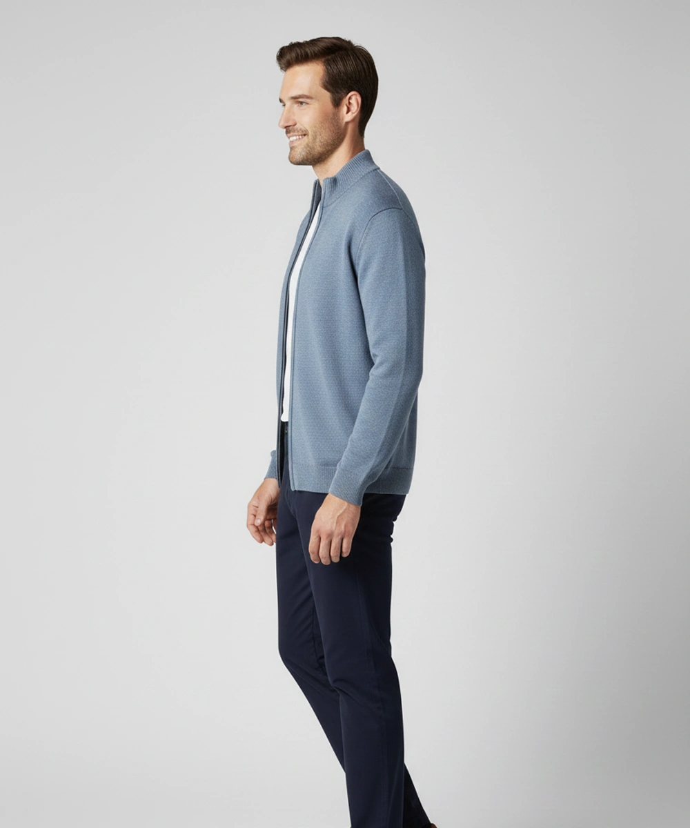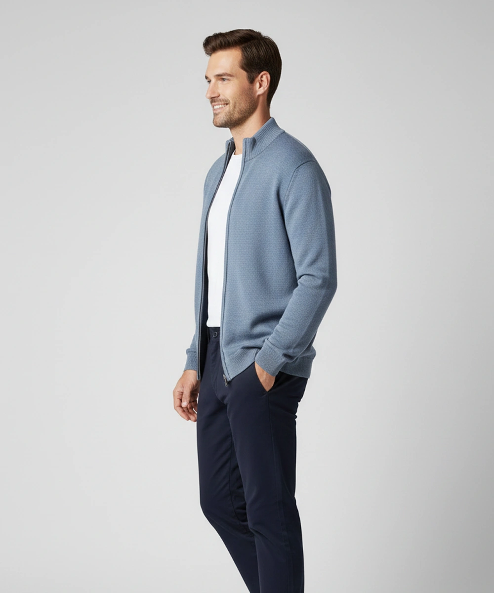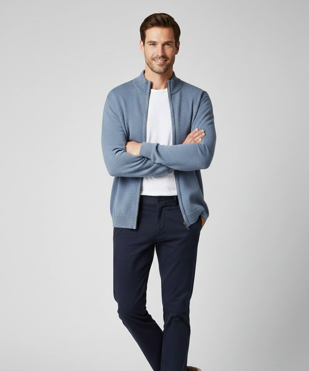 This men’s full-zip knitted sweater combines everyday comfort with a clean, modern design that elevates any outfit. Made from a soft, lightweight blended yarn, it offers just the right amount of warmth without feeling heavy or bulky. The stand collar and smooth front zipper provide a refined look, making it easy to layer over T-shirts, shirts, or winter basics. Ribbed cuffs and hem keep the fit structured and neat throughout the day. A versatile wardrobe essential perfect for work, travel, and casual wear.